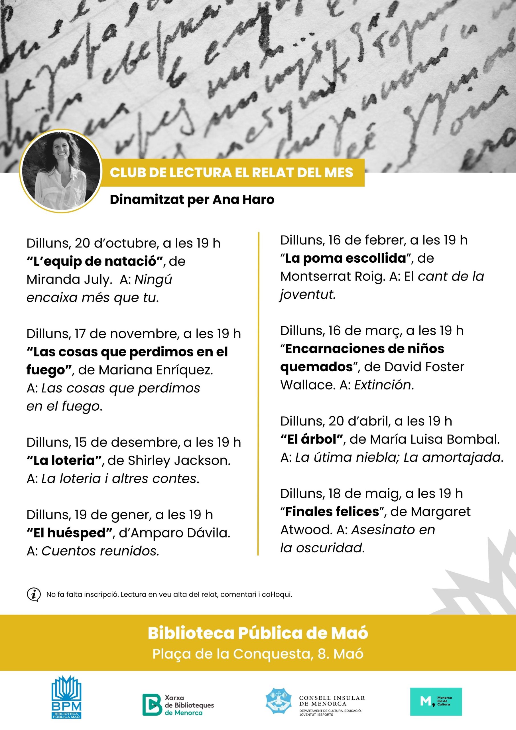 Ya llevamos tres citas del club de lectura «El relat del mes» en la Biblioteca Pública de Maó. Yo no sabía hasta este año lo que era un club de lectura, y sigo sin saberlo, pero lo que voy/vamos descubriendo es una maravilla.